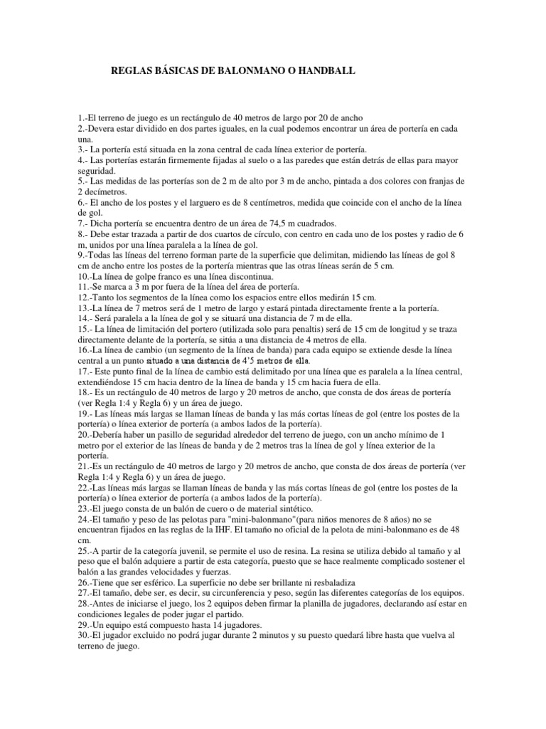 Reglamento del Handball explicado 100 por aficionados del Balonmano. Reglamento Balonmano obtenido del reglamento oficial del año 2010 de la Real federación española de Balonmano La duración del partido La duración normal del partido para todos los equipos con jugadores de más de 16 años es de dos tiempos de. Rectángulo de 40x20 metros. 3 P R Ó L O G O Estas Reglas de Juego entrarán en vigor el 1 de Julio de 2010. El texto de las Reglas los Comentarios la. Es obligación que en cada período actúe un portero diferente.