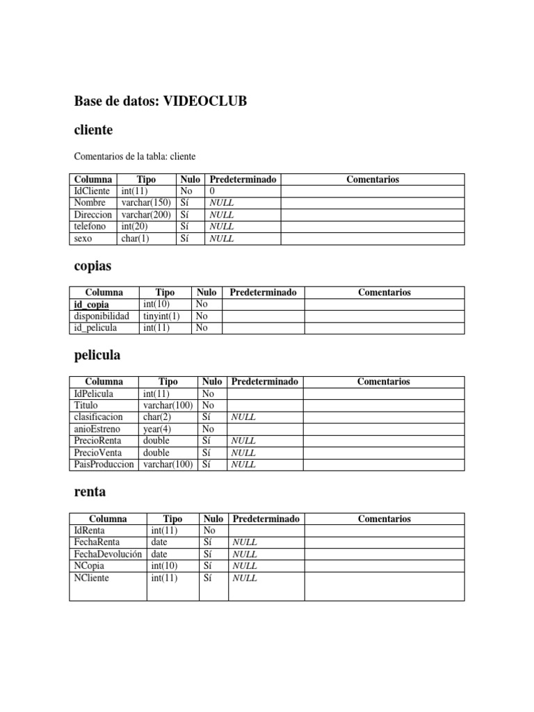 Diccionario De Datos Base De Datos Videoclub Pdf
