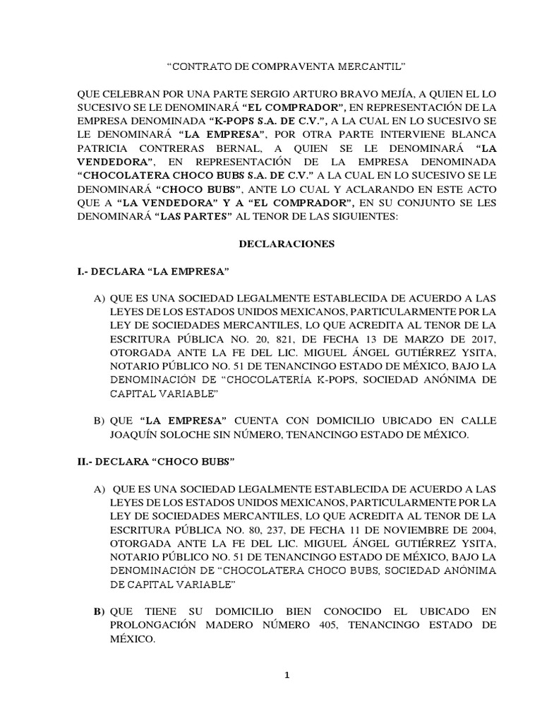 E Finalmente respetar el conjunto de las obligaciones que la legislación vigente así como el presente Contrato le atribuyen y que no han sido previstas en los párrafos anteriores. Cómo descargar el contrato de compraventa mercantil en PDF o Word. Que celebran por una parte sergio arturo bravo meja a quien el lo sucesivo se le denominar el comprador en representacin de la empresa denominada k-pops sa. Solo tienes que hacer click en la imagen del ejemplo de contrato que necesites. Su ejemplo de trabajo constancia y gratitud A mis hermanos Ma. Actos en masas realizadas por empresas.