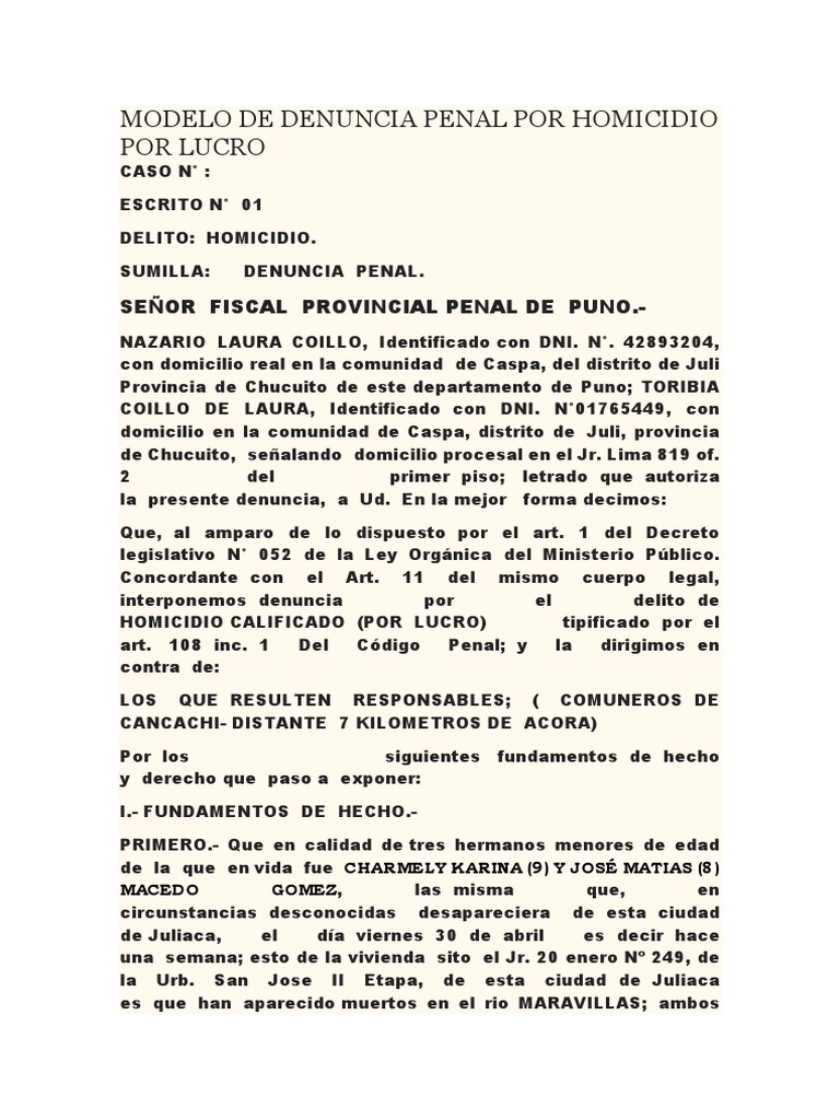 Modelo De Denuncia Penal Por Homicidio Por Lucro Pdf Homicidio Justicia