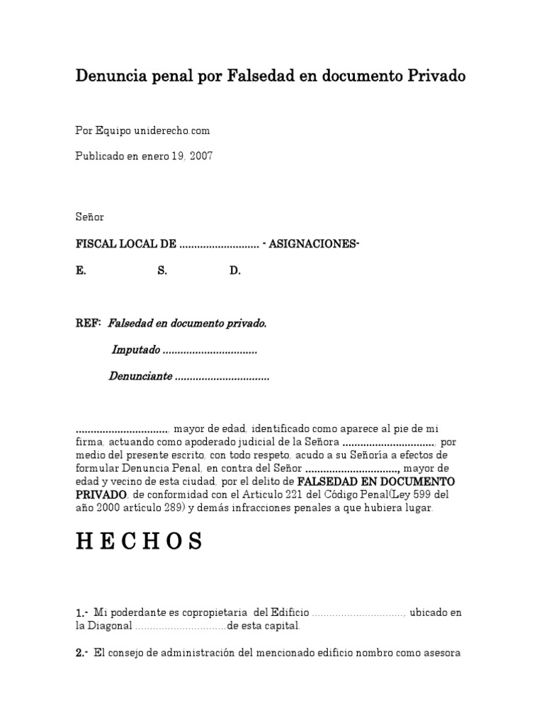 Modelo De Denuncia Falsedad En Doc Privado Pdf Derecho Penal Justicia
