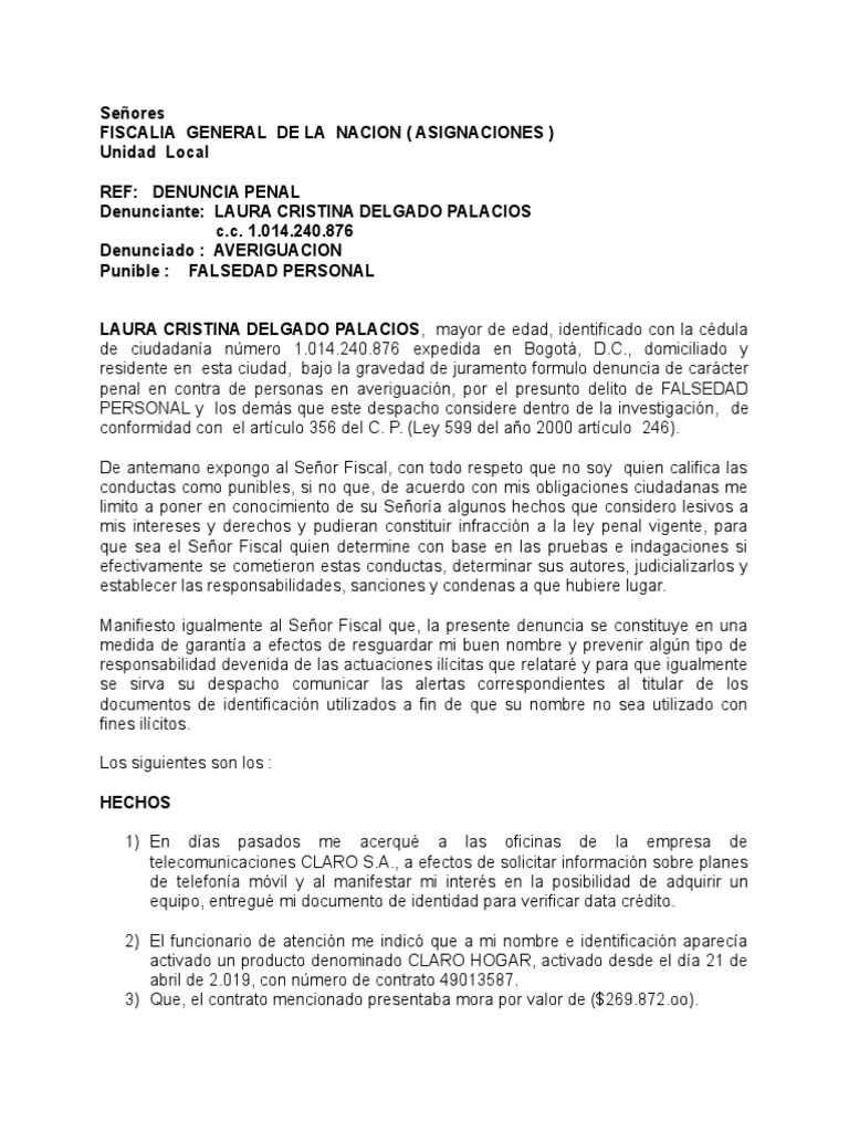 Minuta denuncia penal colombia. Si se trata de hurto en todas sus modalidades estafa falsedad en documento público y privado delitos informáticos material con contenido de explotación sexual infantil extorsión o violencia basada en género usted puede denunciar al través del sistema de denuncia virtual ADenunciar. Todo sobre Recursos de Casación en Colombia. Noticieroficial es una publicación de carácter editorial. _____ del Código Penal y 25 y siguientes del Código de Procedimiento Penal al igual que las demás normas sustanciales y procesales concordantes. Copia de la respuesta al derecho de petición radicado ante la empresa _____ con NIT. Un ciudadano está en la obligación de presentarse ante las autoridades competentes con el fin de formular una denuncia penal si conoce de la comisión de un delito o si es víctima de uno bien sea falsedad homicidio extorsión amenazas lesiones personales tentativa de homicidio acceso carnal violento actos sexuales abusivos trata de.